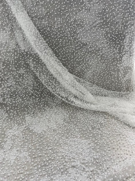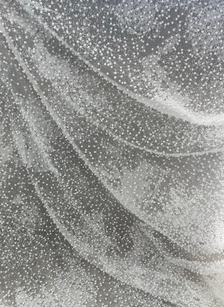 Christobelle transforms bridal dreams into reality with its exquisite combination of pearlescent beads and glitter embellishments on a tulle base. Each element positioned to create a vision of beauty , capturing the essence of timeless bridal elegance. The lustrous pearls provide subtle sophistication while delicate glitter accents add a touch of ethereal sparkle. This premium European textile delivers refined quality and exceptional drape, perfect for creating show-stopping wedding gowns.