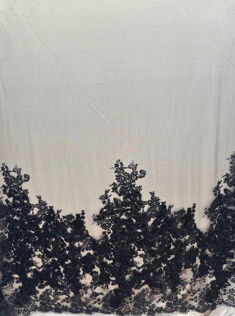 A masterpiece of Italian craftsmanship, this bordered lace of 75cm in width features intricate detailing set against a delicate nylon tulle foundation. The sophisticated interplay of structured lacework and tulle creates an ideal canvas for couture creations and refined evening wear. Perfect for designers seeking luxury in high-end garments.